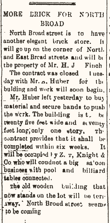 The Downtown Moultrie Welcome Center is housed in the white building at the end of the block on East Central Avenue, but that wasn’t always the case. In 1897, an old wooden building stood on the corner. Little is known about this building or what occupied it, but it is briefly mentioned in an old Moultrie Observer article that states it will be torn down to make way for two new buildings. The article says the new building will be occupied by Z.T. Knight and Company, who will conduct a big saloon business with pool and billiard tables connected. Based on the photograph below, we know at one point, H. V. Westbrook and Bro and H J Finch Bar stood in this location.