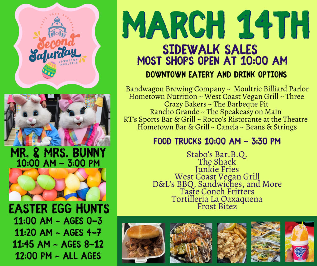 Visit Downtown Moultrie for Second Saturday! Downtown merchants will be holding sidewalk sales, and several area food trucks will gather around the Courthouse Square. Select downtown eateries will be open as well! For more information on the event, call 229-890-5455.